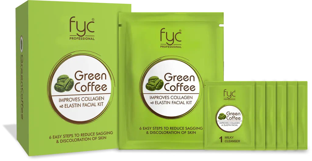 Revitalize and energize your skin with the FYC PROFESSIONAL Green Coffee Facial Kit Pouch—a complete 6-step skincare solution designed to combat sagging, dullness, and discoloration. Infused with Green Coffee Extract, this professional-grade facial treatment targets tired and fatigued skin, helping to restore firmness, brightness, and a youthful glow. Ideal for all skin types, it provides deep hydration, gentle exfoliation, and collagen-boosting benefits for refreshed and radiant skin.